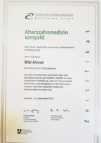 Unser Team besitzt und handelt nach der Zertifizierung durch die Deutsche Gesellschaft für Alterszahnmedizin (DGAZ)